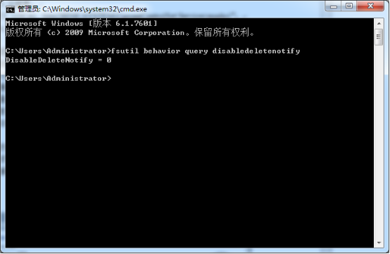 5、如果返回值是1,则代表您的TRIM处于关闭状态