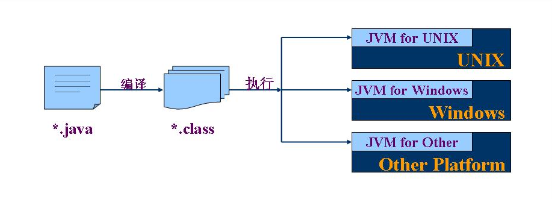 Sun公司在设计JAVA时,就提出了一个理念,这个理念也是JAVA这门语言能够红到现在的重要原因之一,那就是一次编译,到处执行。什么叫一次编译呢?比如说程序员编写出来的JAVA程序都是.java后缀的文件。程序编写完成后,将这些.java文件都编译成字节码格式的文件,也就是.class文件,这样程序就编译完成了。再将这些.class文件拿到各个操作系统平台上去执行,直接执行是不行的,还得先安装个虚拟机。让虚拟机将这些.class文件解释成操作系统平台认识的语言,再去执行。如果在Unix上,则安装个Unix的虚拟机,Windows上,则安装个Windows的虚拟机。这样就叫做一次编译,到处执行。